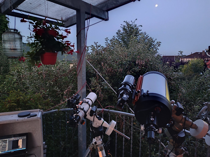 als ich heute gegen 4:30 aufstand war der Himmel natürlich bedeckt. Trotzdem, die Geräte standen aufgebaut und abgedeckt draußen, also warum nicht schauen ob sich das Wetter bessert. Es war kühl, es war windig und es dauerte trotz der Vorbereitung noch fast 45min bis ich beobachtungsbereit war. Der Wind erwies sich als Glücksfall denn gegen 5:20 hatte er die Wolken vertrieben und der Mond stand strahlend am Himmel.