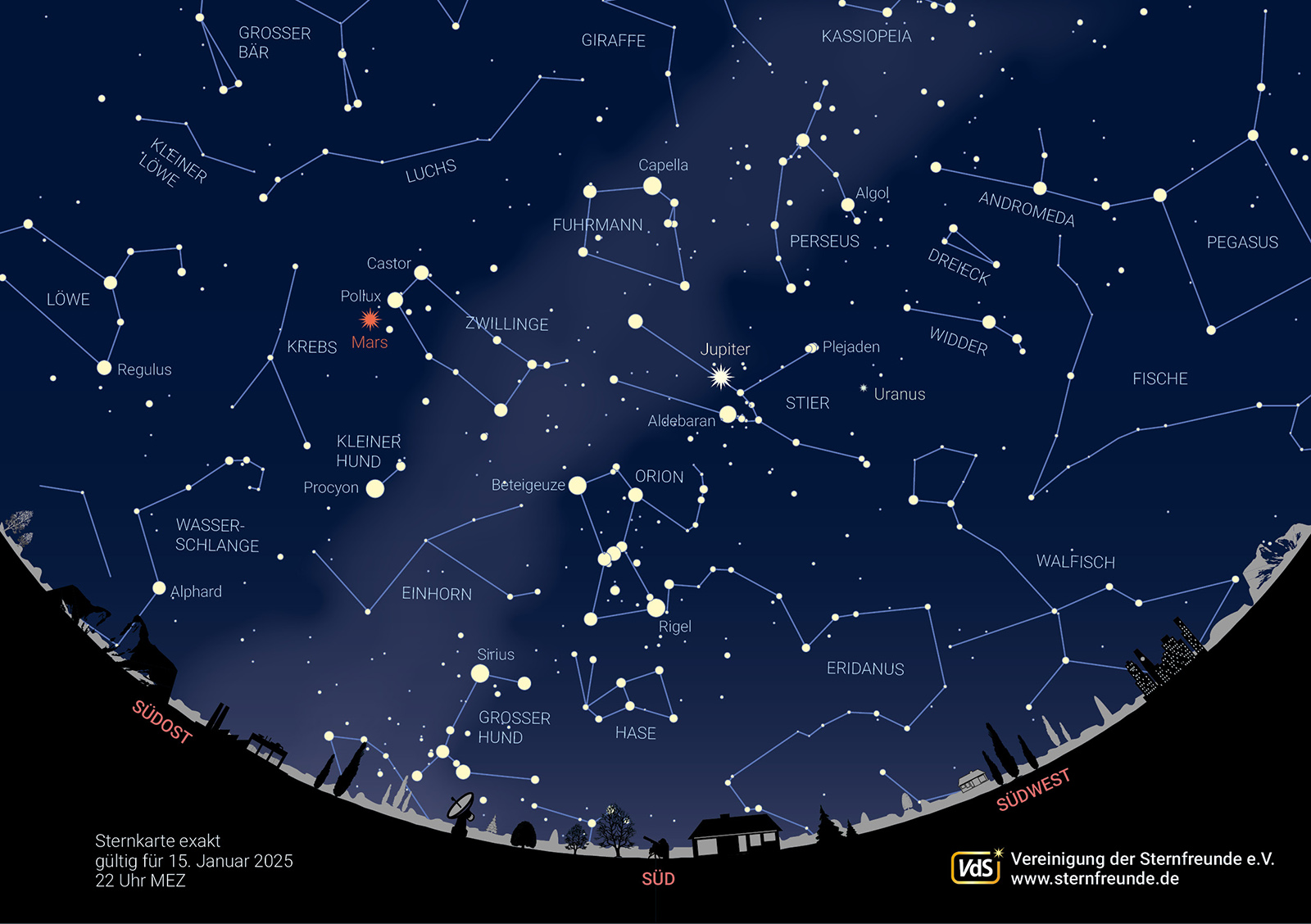 Auf der Januar-Sternkarte – sie gilt für 22 Uhr – erkennt man in Südrichtung das bekannteste Wintersternbild, den Orion. Seine sieben Sterne sind alle sehr hell. In der von ihnen aufgespannten Form kann man sich gut den menschlichen Körper des Himmelsjägers vorstellen. Unterhalb der drei „Gürtelsterne“ entdeckt man mit einem Fernglas den blass schimmernden Orion-Nebel. Der rechte untere Stern des Orion, Rigel, ist gleichzeitig die rechte untere Ecke des Wintersechsecks. Beim Wintersechseck handelt es sich um kein Sternbild, sondern um eine große Figur aus sechs hellen Sternen verschiedener Sternbilder. Im Uhrzeigersinn folgt auf Rigel im Orion zuerst Sirius (im Großen Hund), dann Procyon (im Kleinen Hund), Castor (in den Zwillingen), Capella (im Fuhrmann), und schließlich Aldebaran im Stier.