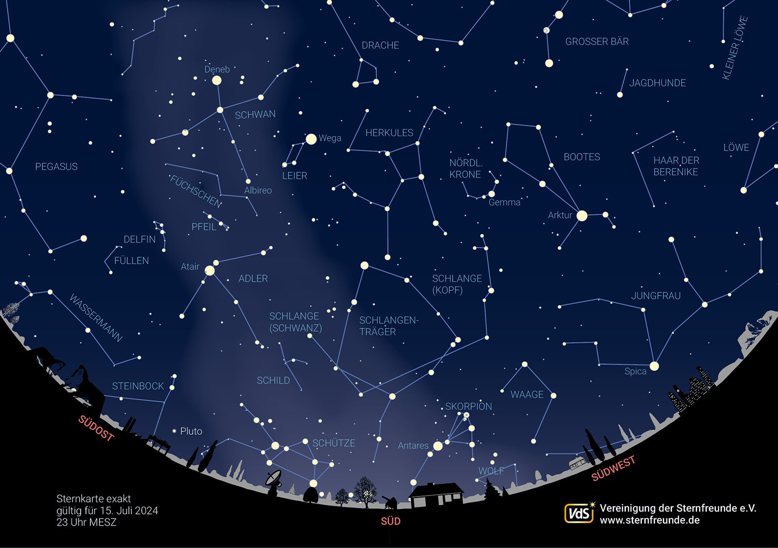 Oberhalb von Skorpion und Schütze verbergen sich die unscheinbaren Sternbilder Schlangenträger, Schlange und darüber der Herkules. Die besonders hellen Sterne am Himmel sind Arktur im Bootes, Wega in der Leier, Deneb im Schwan und Atair im Adler.