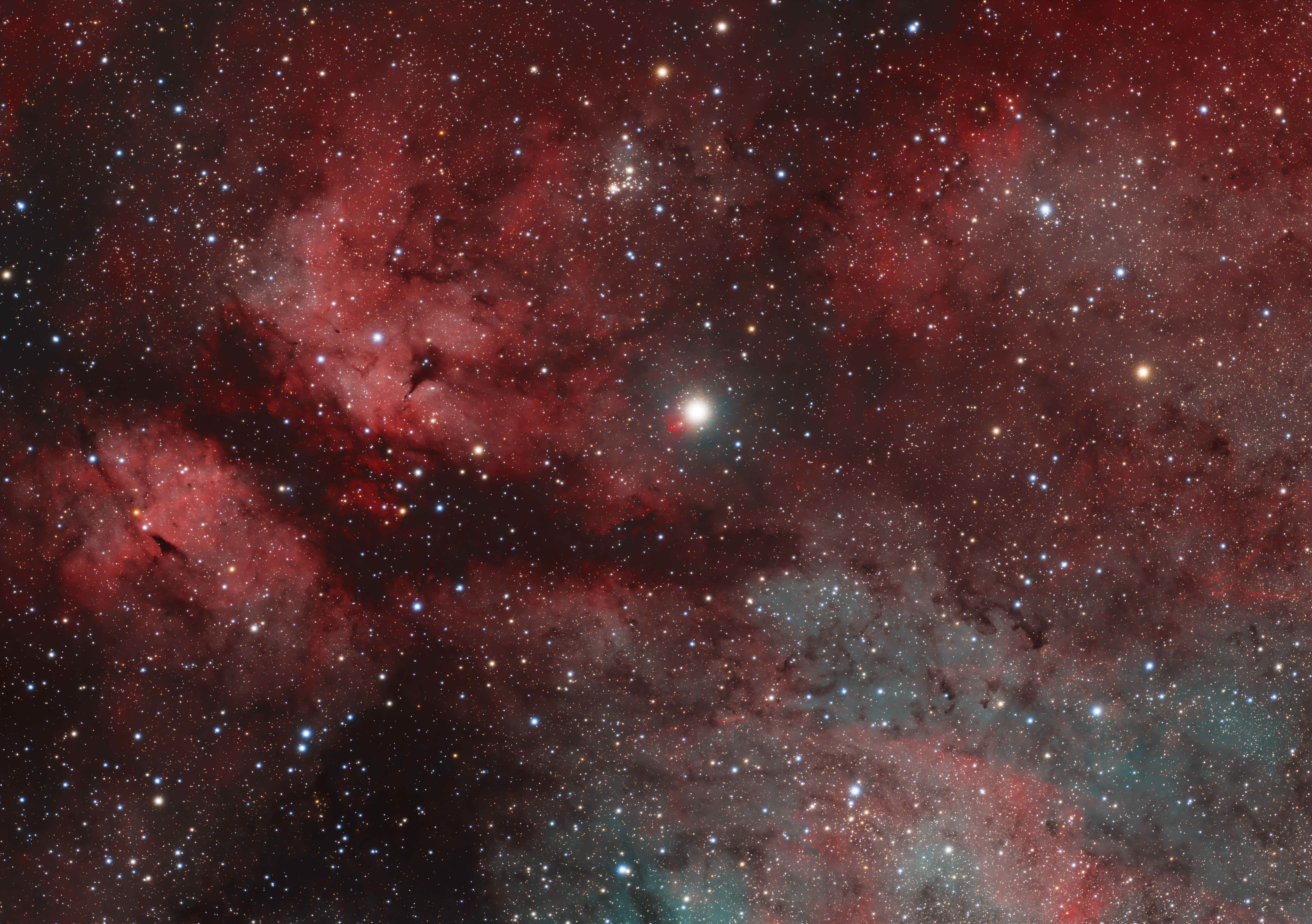 Mit den unterschiedlich lang belichteten RGB,CLS-CCD Aufnahmen habe ich ein HDR angefertigt (v.a. wegen des sehr hellen Sterns Gamma Cygni).