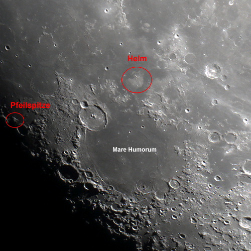 So zeigen sich um das Mare Humorum (Meer der Feuchtigkeit) herum zwei interessante "Red Spots" mit den inoffiziellen Bezeichnungen »Helm« und »Pfeilspitze«. Die beiden Formationen sind bei einem Mondalter von 11 bzw. 24 Tagen gut beobachtbar, weil sie dann nahe des Terminators liegen und sich dadurch reliefartig vom Mondboden abheben. Bei hohem Sonnenstand - also bei Vollmond - erscheinen die Gebiete flach, jedoch sind dann deren Umrisse besser sichtbar.